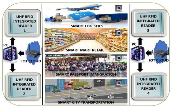 The proposed tag IC memory is 512 bits, which can be read by the SL130 within 96 ms. In one second, the SL130 can easily read approximately 10 tags and, so, 600 tags can be read by the SL130 within 60 s. If four concatenated readers are placed in any smart environment, as depicted in Figure 13, then 2400 of the proposed tags can be read by them per minute. This is a milestone for IoT in smart X environments, facilitating supply chain management through smart logistics, product retailing at smart marts, immigration clearance by smart passports, and transportation and surveillance in smart cities.