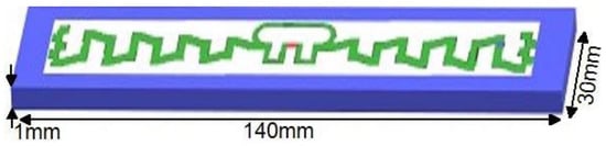 A simulation model for the platforms is shown in Figure 14, and the platform’s dielectric properties (i.e., permittivity and tangent loss) are given in Table 5 []. Each platform’s dimension is 140 mm × 30 mm × 1 mm, with respect to the designed UHF RFID tag. Table 6 elaborates the tag performance on several mounting platforms (i.e., plastic, paper, glass, and water). The proposed North American UHF RFID tag’s bandwidth at center frequency (fc = 915 MHz) is 37 MHz. There was no variation in bandwidth on plastic and paper platforms, while glass and water platforms showed 3 MHz and 7 MHz detection in the proposed tag’s bandwidth, which is enough to cover the specified required bandwidth.