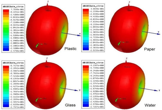 The circuit gain and read ranges of tags are likewise significant parameters, which are depicted in Table 6 for each platform. The circuit gains of plastic, paper, glass, and water were 2.926, 2.516, 1.58, and −1.05 dBi, respectively; their 3D polar plots are shown in Figure 15. By utilizing Equations (5) and (6), we calculated the decent read ranges of the NA UHF RFID tags, which were 8.17 and 5.61 m on plastic and paper platforms, respectively. On the glass platform, the tag read range was 1.95 m, which is significant. The tag had no grip on the water platform w.r.t. circuit gain and read range, which are part of Table 6. The read ranges of the NA UHF RFID tag w.r.t. several platforms and in free space are portrayed in Figure 16.
