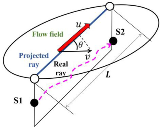 By calculating the range-average velocity Vm of each path, a matrix can be formed to solve the velocity of any point in the observation domain. In addition, we can prove the correctness of CAT inversion results by comparing Vm and the projection of the 2-D flow velocity field in this path, where Δt = t2 − t1. t1 and t2 are nearly equal to tm. Taking the total derivatives of Equation (14), we obtain: