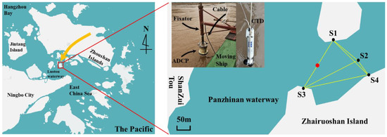 A CAT field experiment lasting 4 hours was conducted in the Panzhinan waterway near the Zhairuoshan Island, Zhoushan. The map of Zhairuoshan Island with adjacent regions and the CAT station array is shown in Figure 2. The northern part of the Zhairuoshan Island was magnified in the right panel, which showed the 4 CAT stations (S1, S2, S3, and S4) and one conductivity–temperature–depth (CTD) cast location in the black and red solid circles, respectively. The yellow solid line was the transmission path of the sound line. The upper left of the right panel contained the shipboard acoustic Doppler current profiler (ADCP) and CTD, respectively. The water depths varied from 20 m at the northeastern part to 30 m at the southwestern part within the observation area. The ADCP was fixed on the ship with a fixator for collecting the velocity and bottom terrain data in a bottom-tracking mode. Additionally, limited information on the flow field was collected by the shipboard ADCP survey along several ship tracks crossing the observation region. The CTD cast was performed to measure the sound velocity and temperature profile in the observation region.