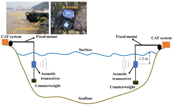 Experimental settings between the two stations; the acoustic transceivers were suspended down to 1–2 m under the surface with an additional weight by a fixed mount, coastal acoustic tomography (CAT) systems were synchronized with the GPS.