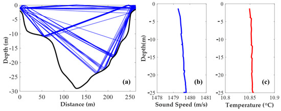 Based on pre-investigations, the velocity of seawater in the Panzhinan waterway was fast causing the seawater at different depths to be well mixed, there was no apparent temperature stratification in the survey zone and the temperature of the survey zone changed little with the depth. Therefore, the information obtained from a 1-point CTD cast should be sufficient to infer the small-scale tomographic domain in the present experiment. The CTD profile data including temperature and sound speed profiles are shown in Figure 4b and c, respectively. The temperature increased with depth due to surface cooling in winter followed by the sound speed. Notably, water in the observation region was well homogenized horizontally because of the strong tidal currents. Hence, temperature stratification was significantly weak and assumed to be constant. Though the variation of salinity has a certain influence on the sound velocity, except for the river mouth, salinity variation is nearly equal to zero [2].