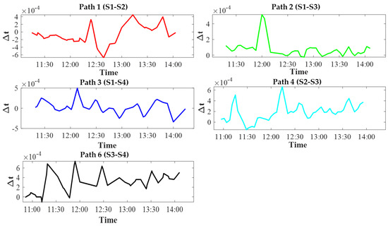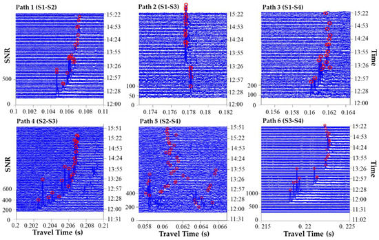 The SNR was the ratio of the peak height to the mean height of the received data in this work [2]. From this definition, SNR was slightly underestimated because signal peaks were included in an estimate of the noise level, and the travel time can be accurately identified. This definition of SNR was convenient for comparison and peak extraction. The travel time was obtained by identifying the largest arrival peaks in the cross-correlation pattern of the received data with the transmitted signal. As shown in Figure 5, the identification of the cross-correlation peaks from S2-S4 (path 5) was significantly unsuccessful. The red circles (arrival peaks) were randomly distributed in time windows. This could be due to the renewable energy platform in the ocean between S2 and S4, which might have negatively influenced signal transmission. Thus, path 5 was not used in the later inversion.