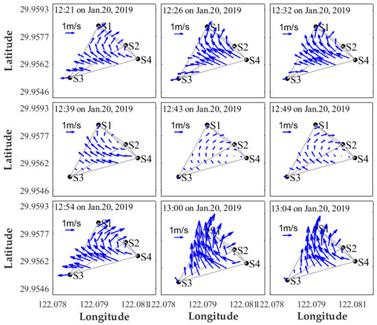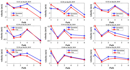 A comparison between ADCP and the projection of the 2-D flow field obtained by the CAT inversion on the path was also necessary to validate the results. The range-average velocity Vm calculated by differential travel time (Δt) was compared to the CAT inversion results. Figure 10 illustrates a comparison of the velocities of five different paths at nine moments, which corresponded to the horizontal velocity fields (Figure 7). Each graph in Figure 10 shows the average velocity of five different paths at a certain time, where the blue hollow and the red triangle solid lines represent the inversion results and the range-average velocity Vm, respectively. The omission of path 5 was due to the influence of the oceanic renewable energy platform (Figure 10). The platform affected signal transmission by either stopping a direct sound path or generating significant noise. From the results, the SNRs of the cross-correlation peaks were weak along the S2–S4 paths (Figure 5).