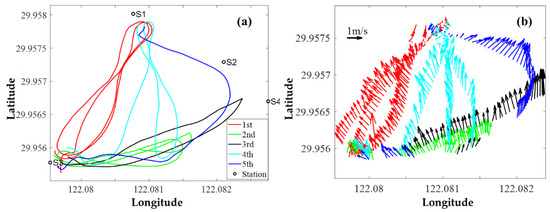The ADCP velocity data with vector plots along the tracks are diagramed in Figure 8. In Figure 8b, the thin arrow in the lower-left is the 1 m/s velocity fields, and the inversion is consistent with the ship-mounted ADCP velocity data, which corresponds to the time when the ADCP ship was on each track (Table 3).