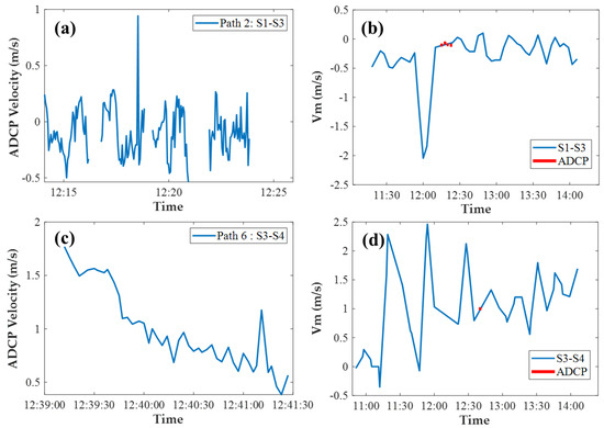 (a,c) are the ADCP measurement data along S1–S3 and S3–S4, respectively; (b,d) are the comparison of the ADCP average data and the range-average velocity Vm. The solid blue lines represent the Vm and the red dots represent the ADCP average value calculated from ADCP measurement data, respectively.