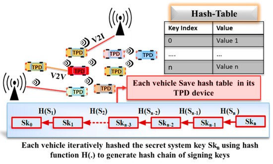 In the initialization phase of the proposed protocol, each vehicle generates a hash chain using an initial secret key provided by the CA at the registration phase. Using a pre-defined hash function, the TPD device in each vehicle iteratively calculates the hashes for corresponding secret keys . It securely generates a hash chain of n elements to determine the signing hashed keys. The shared system key is pre-stored during the registration phase using a hash function H (.), as shown in Figure 2. The overview of the proposed protocol is illustrated in Figure 3. For further details, refer to [9].