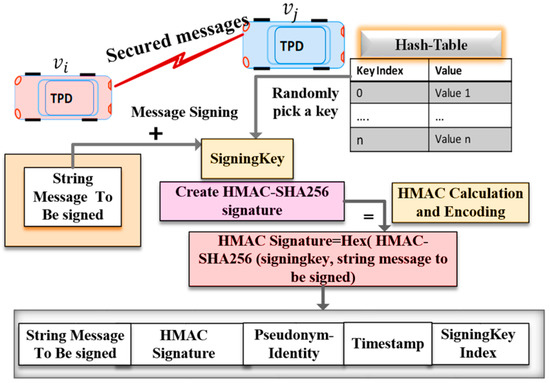 represents the index to the 4-byte hashed key in the hash table, while TS represents a timestamp of 4 bytes to prevent the retransmission of old messages like replay attacks. The signing key size in our implementation is 256-bit since it employs an SHA-256 hashing function. Each registered vehicle has the pre-stored hash-table, which can retrieve the signing key from a given index. Therefore, in the proposed method, the sender only transmits the index of the signing key. Then, the receiver retrieves the key from the pre-stored hash-table using the received index, and it verifies the integrity of the message.