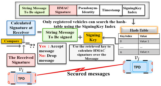 As the sender vehicle calculates the signature over the message using a random key retrieved from the hash table. Then attaches the calculated signature, the signing key index, , the current timestamp, , and the sender pseudo-identity, and , to each transmitted message, as shown in Figure 4. When the receiver vehicle receives the signed message {}, checks the freshness of timestamp Ts. If is invalid, rejects the message; otherwise, verifies the signature of the received message, as shown in Figure 5.