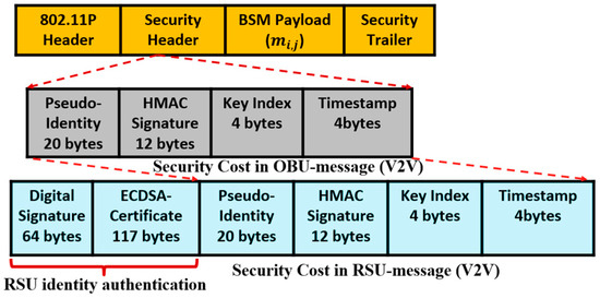Thus, the overhead of message size for the V2V authentication is 20 (pseudo ID) + 12 (HMAC signature) + 4 (key index) + 4 (timestamp) = 40 bytes. Our regular V2V messages employ a short size pseudo-identity to authenticate the hide the real identity and avoid tracking. Although our protocol aims at minimizing the use of ECDSA protocol, some rare events—system key update and vehicle revocation—require vehicle-to-infrastructure (V2I) messages that employ ECDSA certificate to authenticate the RSU. At the beginning of communication, an RSU authenticates itself by broadcasting an ECDSA certificate of 117 bytes and ECDSA-256 signature of 64 bytes, as described in the security protocol standards [22], so the total security overhead for V2I messages is 64 (ECDSA signature) + 117 (ECDSA certificate) + 12 (HMAC signature) + 4 (key index) + 4 (timestamp) = 201 bytes. Figure 6 shows the V2V message format and the V2I message format of the proposed protocol.