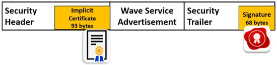 In ETSI-103-097 Standard, RSU devices broadcast additional message types such as DENM, SPAT, MAP, and IVI message types. The security overhead consists of a security header and a security trailer. In the case of DENM messages, the security header size is 199 bytes, and the security trailer size is 68 bytes, which leads to a total overhead of 267 bytes. In the case of the SPAT messages, the security header size is 198 bytes, and the security trailer size is 68 bytes producing a total overhead of 266. In the case of IVI and MAP messages, the security header size is 166 bytes, and the security trailer size is 68 bytes resulting in a total overhead of 234 bytes.