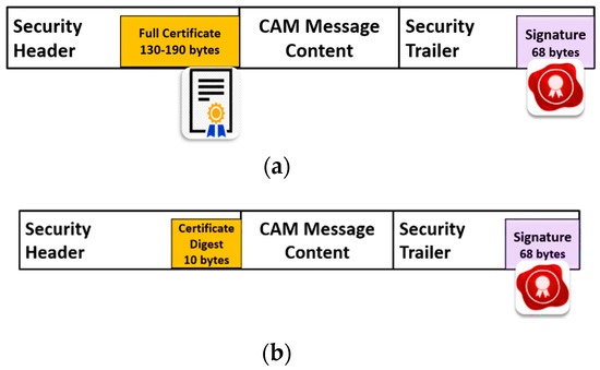 In Figure 8a, a secure CAM packet with a full certificate is presented, and Figure 8b shows the CAM message with a certificate digest. Upon receiving the full certificate in the first CAM packet, each OBU keeps the digest value of the received certificate’s hash to reduce the future verification time and message overhead of the full certificate in the foregoing communication. The majority of CAM message carries only the digest of the certificate’s hash to avoid the overhead of carrying the entire certificate. Upon receiving the future CAM packet, the receiver searches the stored digests of certificates to match the corresponding received certificate and verify the sender. In the ETSI-103-097 security standard, the full certificate size ranges between (130–190) bytes, while the certificate digest size is only 8 bytes. Carrying only the certificate digest reduces the security overhead of CAM’s message authentication. In our experiments, the security overhead represents the size of security header fields (e.g., the certificate or certificate digest, certificate information, and issuer information), and security trailer fields (e.g., the signature). We observed that the security overhead ranges between (90–234) bytes. Carrying only the certificate’s digest introduces a security overhead of only 90 bytes while carrying a full certificate introduces a higher overhead of 234 bytes. Although the use of certificate digest can reduce the overhead to 90 bytes, it is still significantly higher than 40 bytes overhead of the proposed protocol.
