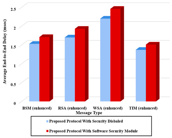 In Figure 14, the average end-to-end delay of IEEE1609 enhanced with the proposed protocol is compared with the case of IEEE1609.2 and ETSI-103-097 standards. From the above experiment of delay measurement, we notice that the proposed protocol only using a low-cost software security module provides a significant reduction in the end-to-end delay compared with the two standard protocols even with a hardware module.