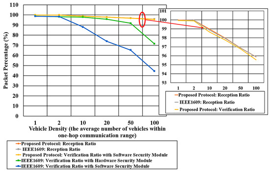 Figure 15 shows the packet reception ratio for the proposed protocol and IEEE 1609.2 (the upper two graphs) using BSM messages. It also shows the verification ratio for the two protocols using a software security module. In Figure 15, the upper two graphs show that the proposed protocol and IEEE1609.2 have nearly the same packet reception ratio. The reception ratio represents the ratio of packets successfully received at the Physical/MAC layer, which is independent of security protocol. The packet reception ratio is defined by Equation (4):