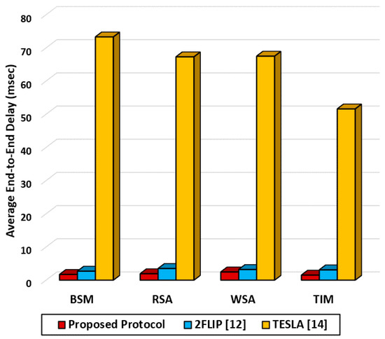 Table 11 compares the processing speed of the three protocols. In the BSM case, the verification speed for 2FLIP and TESLA is 7692 and 23 messages per second, while the proposed protocol provides a significantly faster verification speed of 25,000 messages per second. Figure 16 shows the average End-to-End delay of the three protocols. The proposed protocol reduces the end-to-end delay by 28 times compared with TESLA, while it reduces the delay by 14% compared with 2FLIP. The TESLA protocol exhibits long end-to-end delay up to 72 ms due to its long verification time.