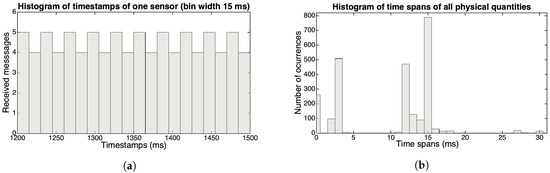 Time spans between IMU incoming messages. (a) Histogram of timestamps of one sensor with a bin width of 15 ms; (b) Histogram of time spans between subsequent messages of all physical quantities in a particular take.