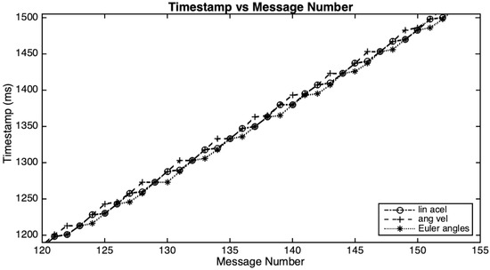 Looking in more detail at the time spans between two subsequent messages of each physical quantity in a particular take, it is possible to note that the most present values are 0, 3, 11, and 15 ms (see the histogram in Figure 1a) and that the overall average for time spans is 9.88 ms. These irregularities are intrinsic to the BLE protocol. If we now look at the timestamps of all messages, then we can see a new aspect of the data transfer. Arrivals (connection events) occur rather regularly every 15 ms, and new values for one or two of the quantities appear twice (which explains the zero interval time mentioned above), and continue to alternate this pattern. Figure 2 plots the timestamp of each message (vertical axis) versus its number during 300 ms of the same take. The histogram of the same timestamps, while using a bin width of 15 ms, is depicted in Figure 1b, where it is possible to observe the alternation between 4 and 5 message arrivals. Although there are variations in the timing of this reception process (as Figure 1b shows), likely most connection intervals used by this setup with a MacBook Pro is between 11.25 and 15 ms, values that are according to Kianoosh Karami [41].
