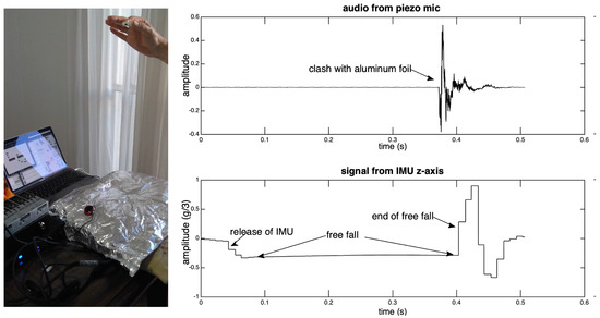Measurement of the IMU response delay. On the left, preparation for the free fall. On the right, two-channel recording with audio and sensor data.