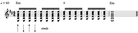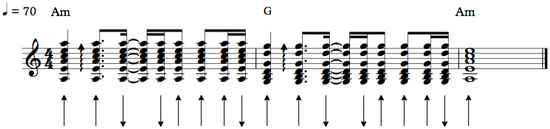 The chosen musical excerpts are: (1) a sequence of down-and-up strummed chords, with a regular rhythm, based on Pink Floyd’s Breathe (Figure 8), with a duration of four seconds; (2) a more complex rhythmic pattern, typical from rock accompaniment, to be interpreted with some freedom (Figure 9), with a duration of ca. eight seconds; and, (3) a sequence of three different percussive musical phrases on the guitar (Figure 10), with durations between one and three seconds.