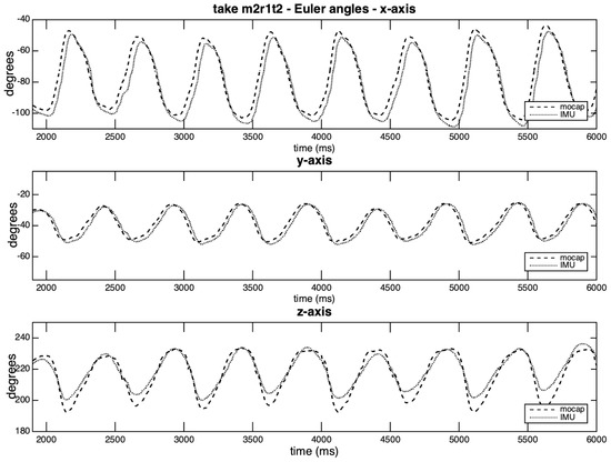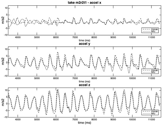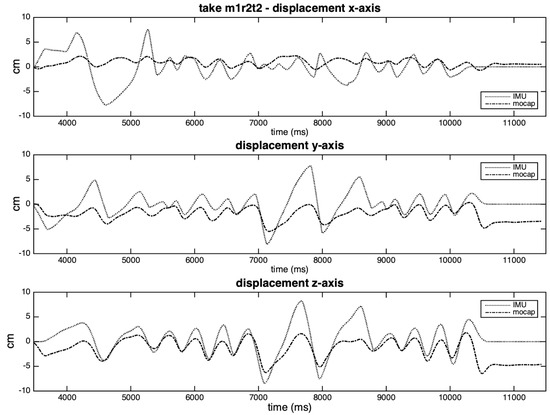 Figure 16 shows the results of the integration process to take m2r1t2, which was balanced according to the stronger lobes. It is possible to observe an overestimation of the values for all axes in the IMU curves, possibly related to the inverse amplitude levels. Not only the inaccuracies in detecting zero-crossings (see Figure 15), but also the flattening of the IMU curves at the beginning and end of the excerpt influences the overall results.