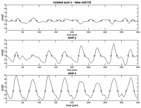 Figure 15 shows the rotated acceleration curves for take m2r1t2, and the contrasting patterns of zero-crossings caused by differences in amplitude and regularity in each axis.