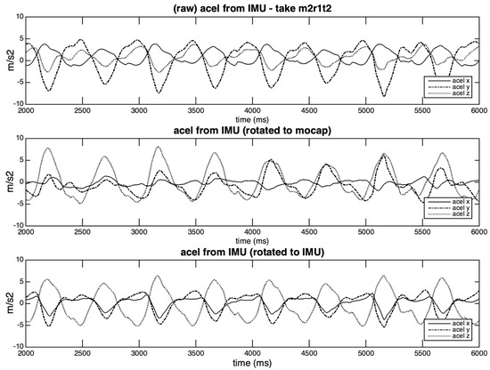 Accelerations curves from take m2r1t2: original, rotated to Qualisys angles, IMU-rotated.