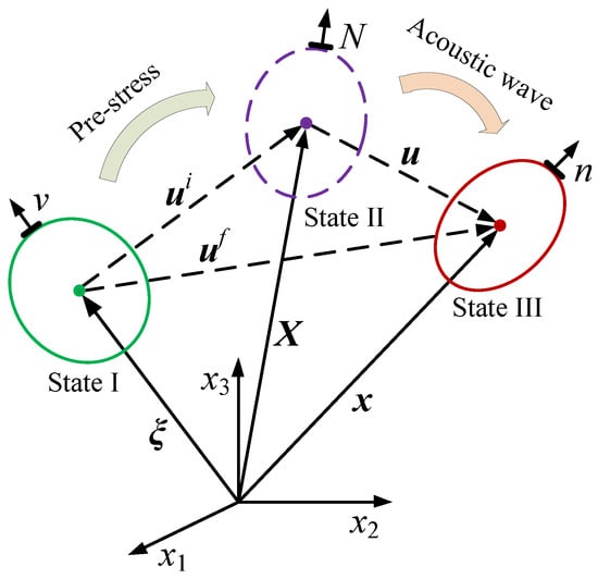 The state of the solid material without stress and strain is called the natural state (state I), as shown in Figure 1. The state of the solid material when it has been deformed or is under a certain load is called the pre-deformed state (state II). A small acoustic disturbance is superimposed on the pre-deformed solid material to further deform the material to the final state—that is, the ultrasonic detection state (state III) [,].