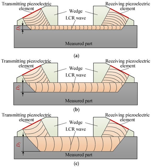 Ultrasonic transducers with different frequencies can generate LCR waves propagating at different depths in the material. (a) Propagation depth of LCR wave at f1 frequency; (b) propagation depth of LCR wave at f2 frequency; (c) propagation depth of LCR wave at f3 frequency.