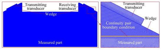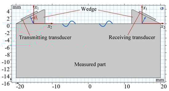 Two transducers were used for one send and one receive. The materials of the wedge and the measured part are PMMA and 1045 steel, respectively. According to Snell’s law, the first critical angle θi = 27.23°, as shown in Figure 4. Therefore, the transmitting and receiving angles are both 27.23° in the finite element simulation.