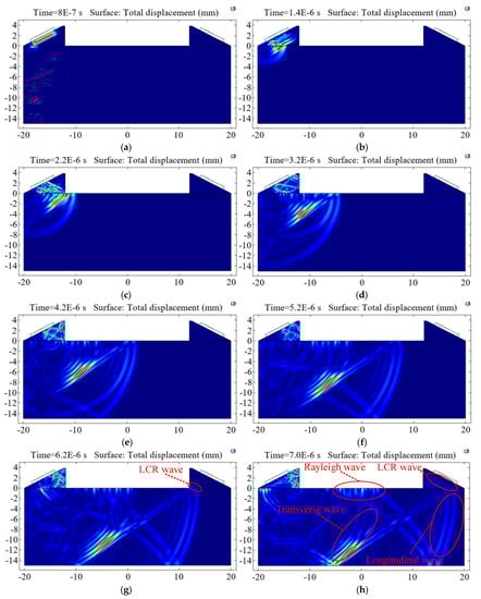 It can be seen from Figure 6 that the ultrasonic wave already appeared under the wedge at 0.8 μs. At 1.4 μs, an arc-shaped wave appeared, which was the longitudinal wave propagating in the steel. At 3.2 μs, an approximately diagonal wave appeared behind the longitudinal wave, which is called the head wave. The other circular wave that appeared behind the head wave is the slower transverse wave. One end of the head wave was tangent to the transverse wavefront, and the other end was connected to the longitudinal wave on the surface of the measured part. At 6.2 μs, the LCR wave began to reach the receiving wedge. At 7 μs, the LCR wave propagated from the measured part to the wedge and was clearly seen to be parallel to the slope. This wave gradually propagated in the wedge and finally reached the receiving transducer.
