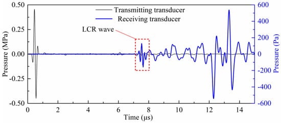 The time characteristics of the sound pressure signals of the transmitting and receiving transducers are shown in Figure 7. It can be seen in the figure that the LCR wave has the fastest propagation velocity and reached the receiving transducer first, which is consistent with the actual situation.