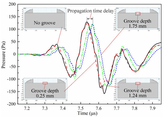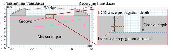 As shown in Figure 8, a groove with a width of 1 mm was set on the surface of the measured part. The LCR wave will be hindered when it propagates to the groove, resulting in a time extension to the receiving transducer. When the depth of the groove is far less than the propagation depth of LCR wave, the blocking effect of the groove is very small, and the propagation time extension can be ignored. In this case, the influence of the groove on the LCR wave is mainly reflected in the slight decrease in amplitude. If the groove depth is greater than the propagation depth of the LCR wave, the propagation distance of the LCR wave will be increased—that is, the LCR wave will propagate downward for a certain distance, which will cause the LCR wave propagation time extension to increase significantly, as shown in Figure 9. Then, the depth of the groove needs to be changed to simulate several times. When the propagation time extension is equal to the time Δt required for LCR wave to propagate 1/20 of its own wavelength, the depth is considered as the propagation depth of the LCR wave.