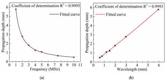 Referring to the step of determining the propagation depth of an LCR wave with a frequency of 4 MHz, the propagation simulation of LCR waves with frequencies of 1, 2, 3, 5, 7.5, and 10 MHz was carried out successively. The propagation depths were 5.78, 2.79, 1.81, 1.10, 0.65, and 0.49 mm, respectively, as shown in Figure 10a. According to the distribution characteristics of the propagation depth of LCR waves at different frequencies, exponential function and power function were used to fit the LCR wave frequency and its corresponding propagation depth, respectively. The coefficients of determination for exponential function and power function fitting are 0.9901 and 0.9993, respectively, so the power function fitting was used to obtain the calculation formula (7) of the propagation depth of LCR waves at different frequencies: