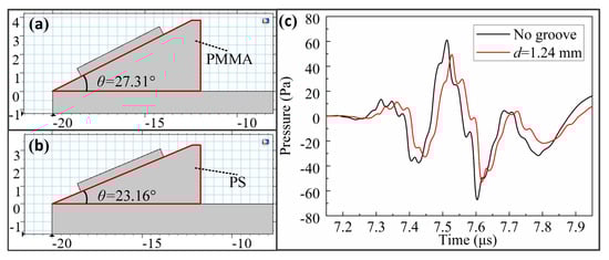 In this paper, PMMA was used as the wedge material in the simulation analysis of the relationship between the propagation depth of LCR wave and frequency, as shown in Figure 11a. To study the influence of wedge material on the propagation depth of LCR waves, PS was selected for the simulation and comparative analysis. According to Snell’s law, the first critical angle is 23.16° when using PS as the wedge, as shown in Figure 11b. When using PMMA as the wedge material, the LCR propagation depth at a frequency of 4 MHz is 1.24 mm. Therefore, as shown in Figure 11c, we directly analyzed the amount of LCR wave propagation time extension caused by the 1.24 mm groove when the PS was used as a wedge. By comparing this extension with that when using PMMA as the wedge, it can be determined as to whether the wedge material affects the propagation depth of LCR waves.
