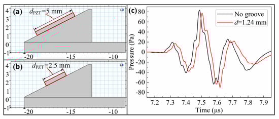 In this paper, the diameter of the piezoelectric element used in the simulation study of the relationship between the propagation depth of LCR wave and the frequency was 5 mm, as shown in Figure 12a. To study the effect of piezoelectric element size on the propagation depth of LCR, a piezoelectric element with a diameter of 2.5 mm was selected for simulation and comparative analysis, as shown in Figure 12b. When using a piezoelectric element with a diameter of 2.5 mm, the LCR wave propagation time extension caused by the 1.24 mm groove was directly analyzed, as shown in Figure 12c. By comparing this extension with the extension when the diameter of the piezoelectric element was 5 mm, it can be determined whether the piezoelectric element diameter affects the propagation depth of LCR wave.