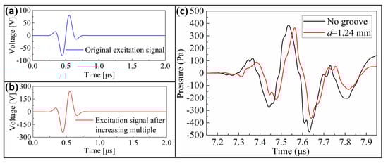 Using the cross-correlation algorithm, it can be seen that when the excitation signal S2(t) was used, the propagation time extension of LCR wave generated by the 1.24 mm groove is 12.51 ns. It is the same as that when the excitation signal S1(t) was used. Therefore, when the excitation signal S2(t) was used, the propagation depth of the LCR wave with a frequency of 4 MHz is still 1.24 mm; that is, the propagation depth does not change after the excitation voltage is increased. By comparing Figure 9 and Figure 13c, it can be concluded that the sound pressure amplitude of the LCR wave generated by the excitation signal S2(t) is exactly three times that generated by S1(t). This means that as the value of the excitation signal increases, the sound pressure amplitude also increases proportionally.