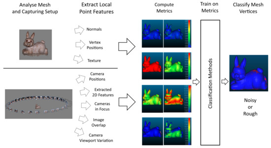 The main contribution of this paper is the exploration, development and evaluation of a number of metrics for determining if the underlying 3D reconstructed surface is noisy or rough. An overview of the idea proposed in this paper is shown in Figure 2. The proposed metrics are chosen based on the known weaknesses of SfM solutions, as well as on the underlying principals used in many of the state of the art mesh simplification, quality assessment and denoising algorithms, given in the next section. For testing the proposed metrics, we have created a image dataset from a number of number of different objects. This dataset, together with the ground truth noise annotations for testing are available online (Dataset: dx.doi.org/10.17632/xtv5y29xvz.2).