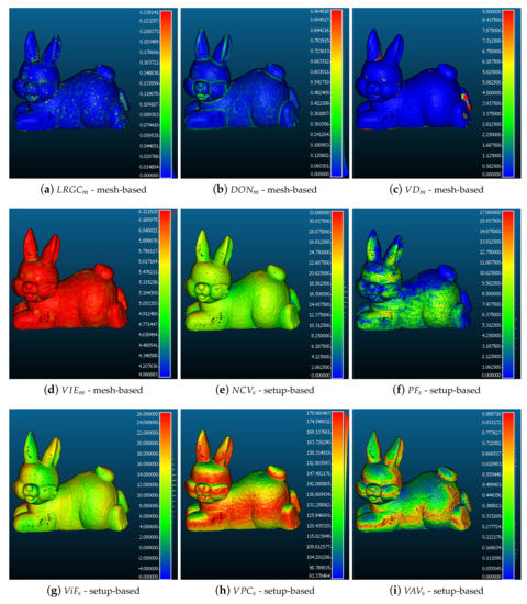 A visualization of each of the metrics on the surface of a reconstructed mesh is given in Figure 4. In the subsections below we will focus on each of the metrics’ theoretical basis, extraction methods, interpretation, etc. For easier readability each of the metric abbreviations will have a subscript of m for mesh-based or s for capturing setup-based. Before computing each metric, the reconstructed object is scaled to absolute real-world scale. Once all the metrics have been presented, they will be analyzed to determine their level of correlation. This will be presented in the Results Section 5.