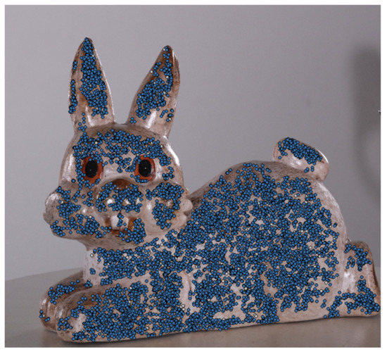 We look at the 2D features extracted in the triangulation and camera position calculation step of the SfM pipeline. In this step features are extracted from each image and matched between them. In most SfM solutions, these 2D feature descriptors are not disclosed, but they are mostly variations of SURF [38] or free alternatives like FAST [39] and ORB [40]. An example image with captured feature points can be seen in Figure 5, where it can be seen that smooth areas like the eyes and noise of the bunny statue have much less features. For each camera position, the already calculated feature descriptor points are extracted. A radius around each point is set and the points under that area are projected to the 3D reconstructed model. For each 3D point the metric as aggregated depending on how many of these matched feature point areas are projected onto it.