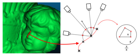 This metric is captured by computing the angle between each normal and the forward direction of each of the calculated cameras that can “see” the vertex. This is achieved by using Equation (Section 3.2.4), where is the calculated angle between the normal of vertex and the camera forward direction vector for each camera seeing the vertex . Two 3D vectors are parallel, if the angle between them is either 180 or 0 degrees, but the camera has to be able to see the vertex, so an angle of 0 degrees is not likely. The closer at least one angle is to 180 degrees, the less chance there is of noise. Figure 4h shows this metric.