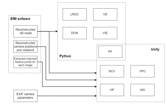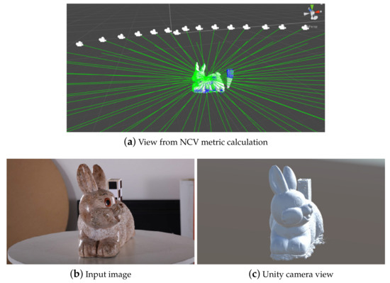 In this section a short overview of the implementation pipeline is given. The different processing environments for extracting each of the metrics are given in Figure 7. The initial data of the reconstructed mesh, the camera positions and orientations and extracted feature points are taken directly from the SfM software. For our current implementation Agisoft Metashape [15] is used, but the same data can be extracted from many of the commercial and open source SfM applications. In our case Metashape uses a Python based API for automation of the SfM pipeline, which can be also used to extract the required data and parse it in a structure, used for metric extraction. For the purely mesh-based metrics only the reconstruction itself is used and the processing is done directly in Python. For extracting data and manipulating the 3D data, the library open3D [43] is used in. The extracted features are manipulated and the areas around them calculated, by using OpenCV [44] for Python. The capturing setup-based metrics are calculated through the use of the Unity game engine [45]. The engine uses C#, with specific optimizations for vector and GPU computations. Normally used for making games and interactive experiences, we use the powerful 3D features of the engine, the camera settings and the fast and easy ray calculating capabilities. The data from the Metashape Python API in these cases is saved to a custom format containing all the mesh data—vertices, faces, normals, color information, as well as camera positions and orientation. For these metrics, the EXIF data from each image is also used, for calculating the proper field of view and depth of field of each of the cameras. The setup-based metrics are calculated per mesh vertex, by casting rays from each pixel of the camera positions to the reconstructed surfaces. An example view of the Unity implementation is given in Figure 8a, where the reconstruction together with the calculated camera positions and their forward direction vectors are given. The projected points on the mesh are used to calculate the NCV metric and show which parts of the object are seen by the particular camera. The input photo and the equivalent view from the Unity camera are given in Figure 8b,c.