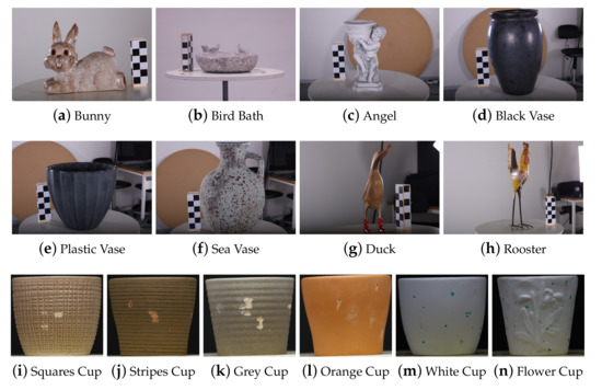 To ensure the robustness of the proposed metrics, objects with different shape, size, roughness and color, as well as material were used. All the objects are shown in Figure 9. Special care was taken to create a diverse set of objects, to lower the possibility of bias in the proposed metrics. Some of the ways the dataset could be separated: