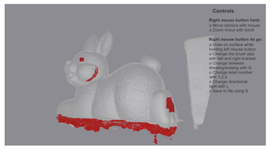 For testing the proposed solution and training the classification methods, a roughness/noise ground truth was created for all the used objects. The ground truth was made manually by annotating all the reconstructed meshes and masking all vertices of surfaces containing noise or any other topological defects. The software used for annotation of the mesh vertices was also developed in Unity (Figure 10) and at the end of the process the information for each vertex for each of the objects was saved into an array of values—showing 0 for clear surfaces and 1 for noise and geometrical defects. This annotated data were also used for testing the correlation between the appearance of noise and the different metrics.