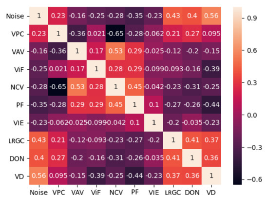 The correlation between the different independent metrics needed to be tested, to ensure that highly correlated ones were removed, as they did not give any new information and could introduce uncertainty and interfere the detection of the noise. In addition, the correlation between the metrics and the appearance of noise was also analyzed. To compute the correlation between the metrics a correlation matrix was calculated using the Pearson correlation coefficient [46]. The matrix is shown in Figure 11.