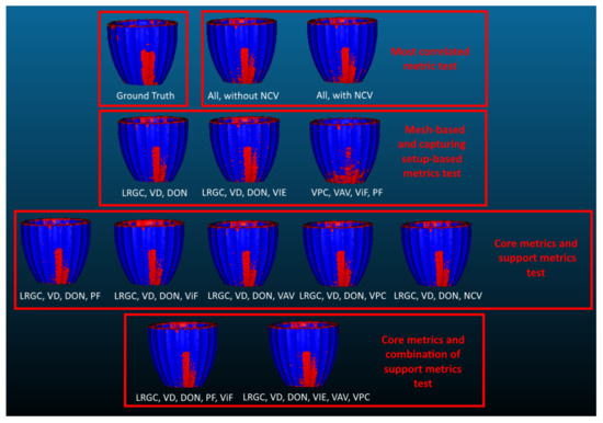 We chose to consider a cutoff between metric correlation higher than and with the dependent variable lower than . From the correlation matrix it can be seen that one of the metrics had a high correlation with the others—the number of cameras seeing each vertex (). Because this metric was quite generic and much of the information that it carried was present in the vertices seen from parallel camera (), with correlation of and the vertex area visibility (), with correlation of , as well as projected 2D features () metric, we chose not to include in the final set of metrics.