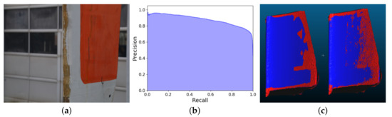 We chose also the best performing combination of metrics—all except . All the reconstructions used in the previous testing scenarios were used as training data for AdaBoost. To evaluate the performance of the metrics on the blade, ground truth noise and roughness annotations were also made for it. The calculated classification results had an accuracy of , while the precision was and recall was . For this test the precision-recall curve was also calculated for giving a better idea of the performance of the trained model using the proposed metrics (Figure 14b). We chose to use it instead of a ROC curve, on the basis of the unbalanced dataset. This way the calculated results were going to be less skewed and “optimistic” [50]. The area under the curve (AUC) of the precision-recall curve is . Finally, the pseudo-colored visualization of the classified and annotated vertices for the wind turbine blade model are given in Figure 14c. Overall the metrics provided acceptable results, by capturing all the problem areas around the top, bottom and back of the object, without misclassifying the real damaged areas of the edge of the blade. This showed that a transfer learning effect could be used, where the training could be done on more easily accessible generic 3D reconstruction objects and how noise was seen on them, and then the trained classifier could be used on specialized input data like wind turbine blades, with high level of accuracy.