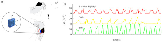 (a) Setup of the motion sensor, which is placed on the patient’s hand, during the passive wrist flexion. This configuration ensures that the wrist flexion is performed along the MoMo system, independently from the hand pose. Extracted from [13]; (b) Example of angular velocity signals correspondent to when baseline rigidity was being assessed, to 50% and 80% improvement in rigidity. Each arcade corresponds to a wrist flexion. With a reduction of rigidity, it is clear that the signal becomes smoother and higher peak values are achieved.
