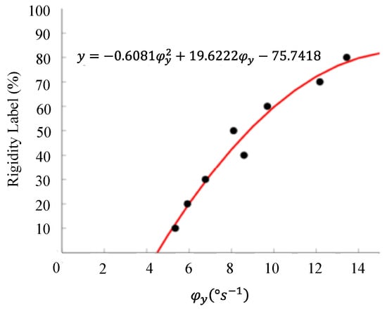 From the statistical analysis’ results summarized in Table 2, we concluded that had more discriminative power between rigid and non-rigid states, since their p-values are lower than the p-values of its counterparts. The polynomial model derived for rigidity classification is presented in Figure 2 and had a training error of . This error range was considered acceptable, since we modeled a discrete scale using a continuous function. The classification model allowed a correct classification of 131 out of 156 classifications of rigidity, corresponding to an accuracy of 83.9% [13].