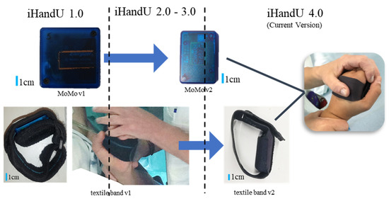 The iHandU system includes a wearable device named Motion Mote (MoMo), a Bluetooth-enabled inertial measurement unit (IMU), attached to a textile band, on the palm of the patient’s hand, which communicates via Bluetooth with an external device. Over these years, the system has undergone two main developments concerning the wearable device (see Figure 3): first, the IMU was improved with a smaller design, maintaining all the features, with the aim to obtain a smaller form-factor (MoMo v2). The frequency rate was changed from 42 to 50 Hz due to the higher computational power of the MCU; More recently, the textile band of the iHandU 1.0, 2.0 and 3.0 (textile band v1) was also re-designed with the support of a high-quality national textile company (Petratex®) with whom we have been working since 2015 due to their innovative and patented textile techniques that are of most importance for the development of new prototypes. It allowed to increase the comfort of the wearable device for both patient and clinician. This new band (textile band v2), which is part of the iHandU 4.0, presents some advantages over the previous one, since it was specially designed taking in account all the feedback and contribution of the clinical experts. To summon, it was an iterative development resulting in a slimmer, more comfortable and hypoallergenic textile band that can be placed in the patient’s hand more easily and, therefore, more quickly. Another important advantage is its possibility of hardware part removal for washing, which is of major importance to avoid any contamination.